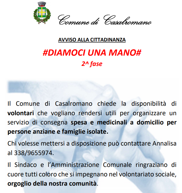 Il Comune di Casalromano chiede la disponibilità di volontari che vogliano rendersi utili per organizzare un servizio di consegna spesa e medicinali a domicilio per persone anziane e famiglie isolate.